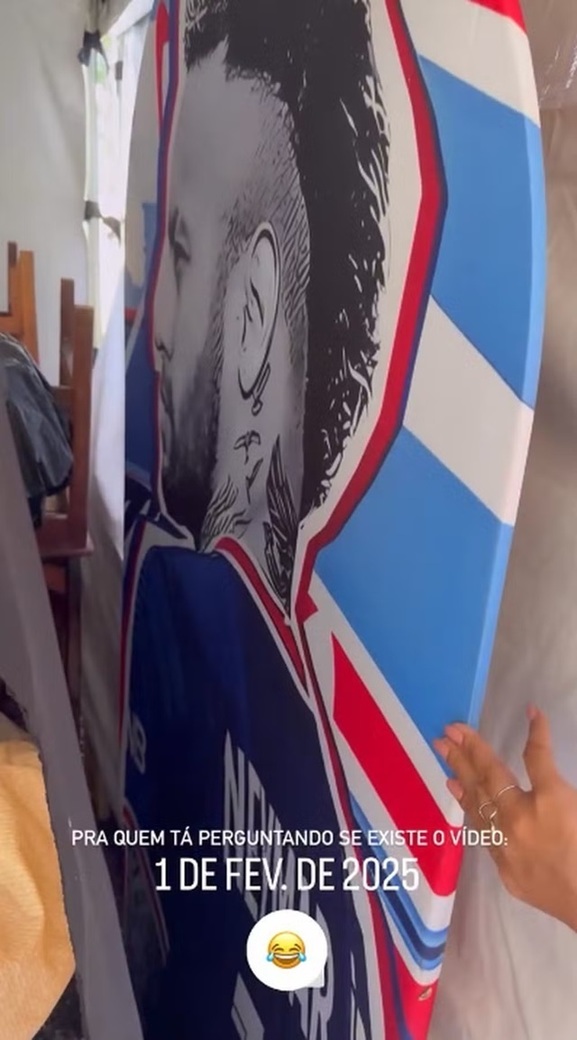 Na sequência, Jéssica Beatriz Costa mostrou a imagem do jogador de futebol que foi retirada da decoração do aniversário de seu filho. “Pra quem tá perguntando se existe vídeo”, disse ela ao recordar a gravação. Nas imagens, é possível ver o totem de Neymar escondido e Matheus achando graça da situação. “Mostra aí, Carol. Aniversário do Noah e qual é o tema? Ê, meninão”, brincou o cantor.