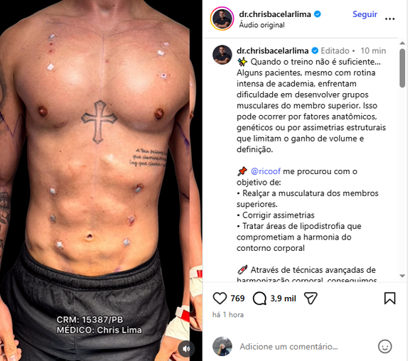 A 15ª operação do influenciador tem foco em criar o efeito de definição muscular, destacando o contorno do abdômen e das pernas. O campeão de "A Fazenda 13" passou por mudanças no peito, abdômen, além de realce na musculatura das pernas.